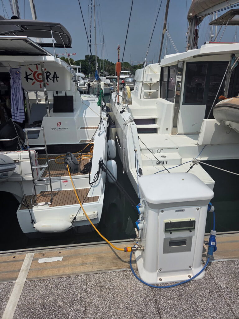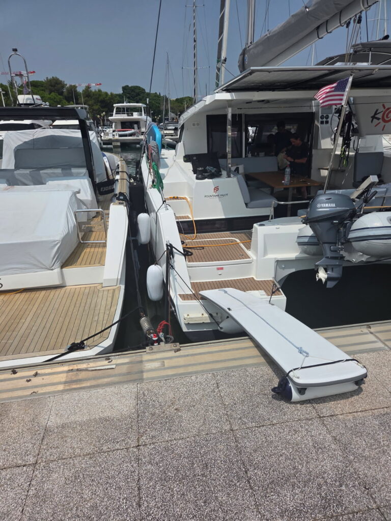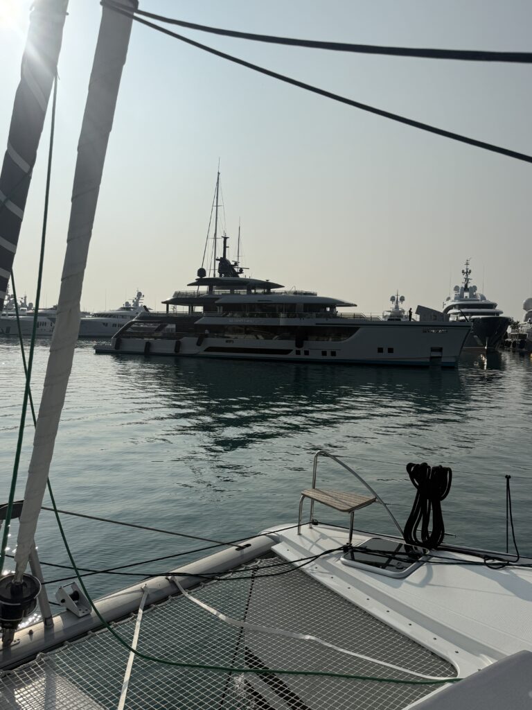 If med mooring were an Olympic sport, Doug just took gold!🏅Sliding Kora into a tight slip in the sparkling Port Vauban. Entering the tightly packed marina we were surrounded by multi-million-dollar mega yachts, but Doug navigated the narrow fairways like a seasoned pro. One wrong move, and we’d be writing checks for more than our boat is worth. But with a little dual-engine magic and Kate heroically launching a big ball fender just in time to save our starboard stern as a gust pushed us sideways, we nestled perfectly between two friendly neighbors. In “the sticks” of the marina, of course, where boats range from a modest €300K to a mere €1.5 million… while the real mega-yachts (read: €100 million+) sparkle at the far end like floating palaces.