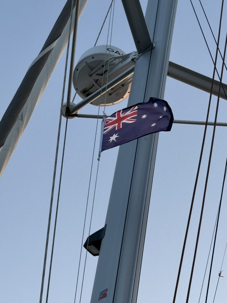 June 9 started early with us cheering from the deck as the Volleyroos scored a big win over India at the AVC Nations Cup – go Aussies! Kora flew the flag proudly, even as we said a heartfelt goodbye to Kate, who headed home after a heroic stretch as crew.