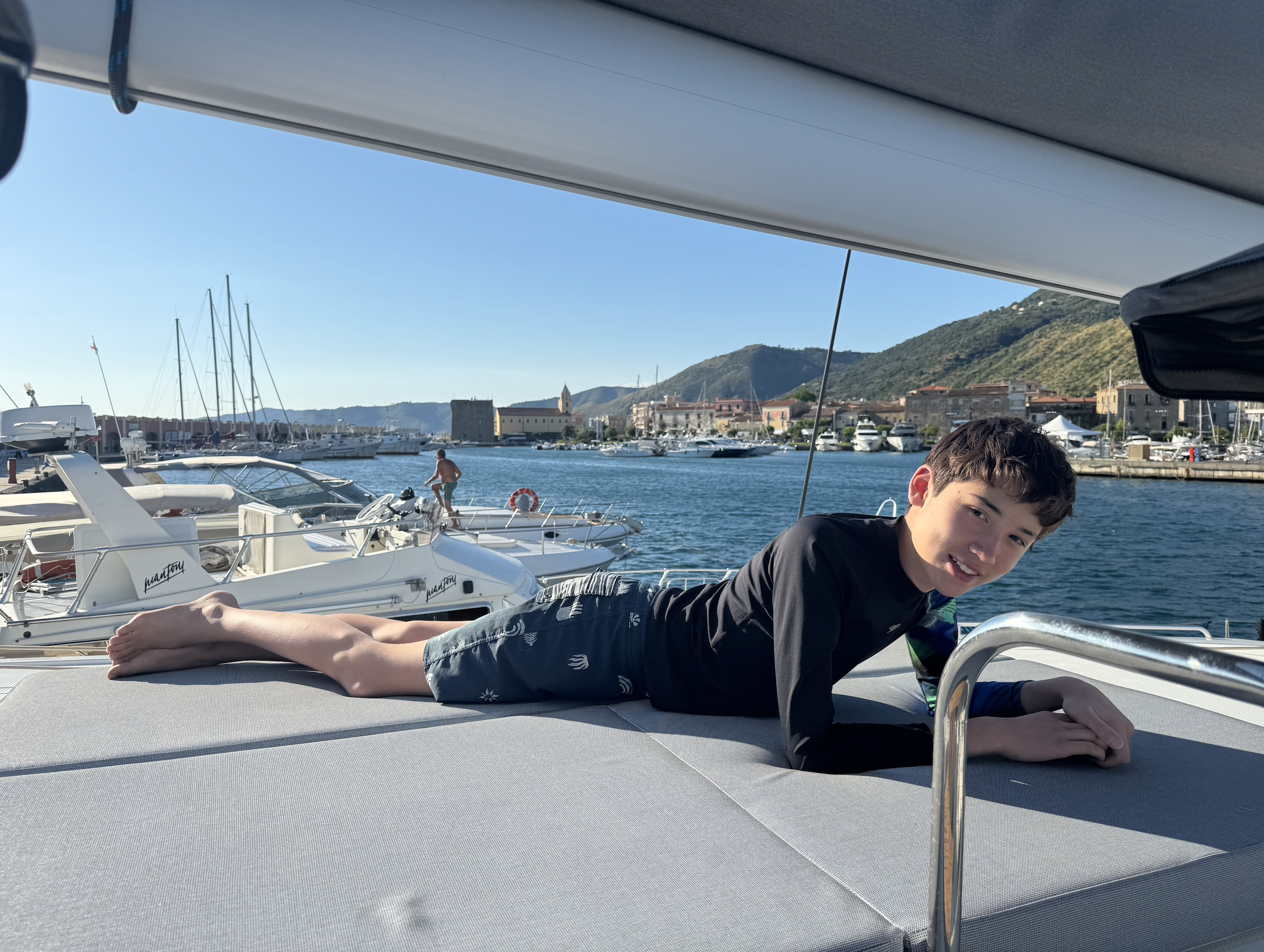 Back on Kora, we relaxed on the bow, toes up, beach in view. The rest of the crew returned shortly later and agreed: Kora’s lounges beat any sunbed on land.