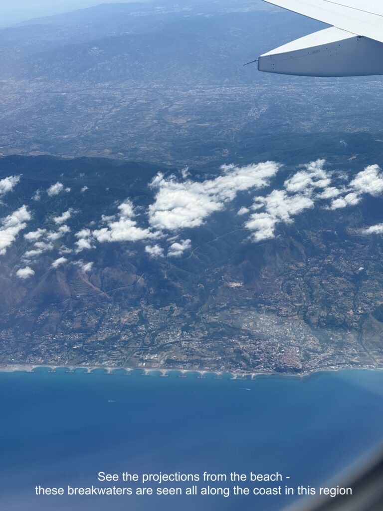 We pulled into a lovely mooring field in Reggio Calabria called Nautica Mediterranea – Campo Boe. (A borrowed aerial photo of the mooring field is seen above as the featured image.) Oscar, we missed you here – this was your chance for a mooring ball adventure! Karen missed it too, to be fair, fast asleep as Doug single-handedly ran the operation with the help of two wonderful marineros. The service here was impeccable. They greeted us with smiles, guided us in, and offered dinghy service to and from shore – whether for a beach visit, a grocery run, or dinner at their lovely family-run restaurant.