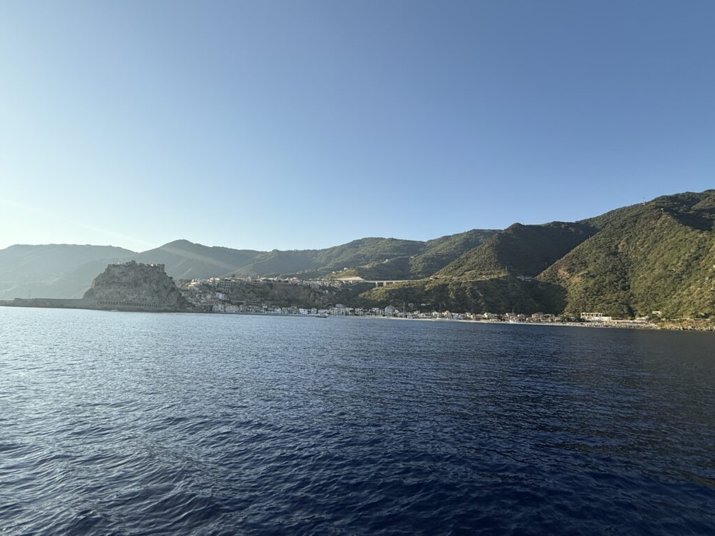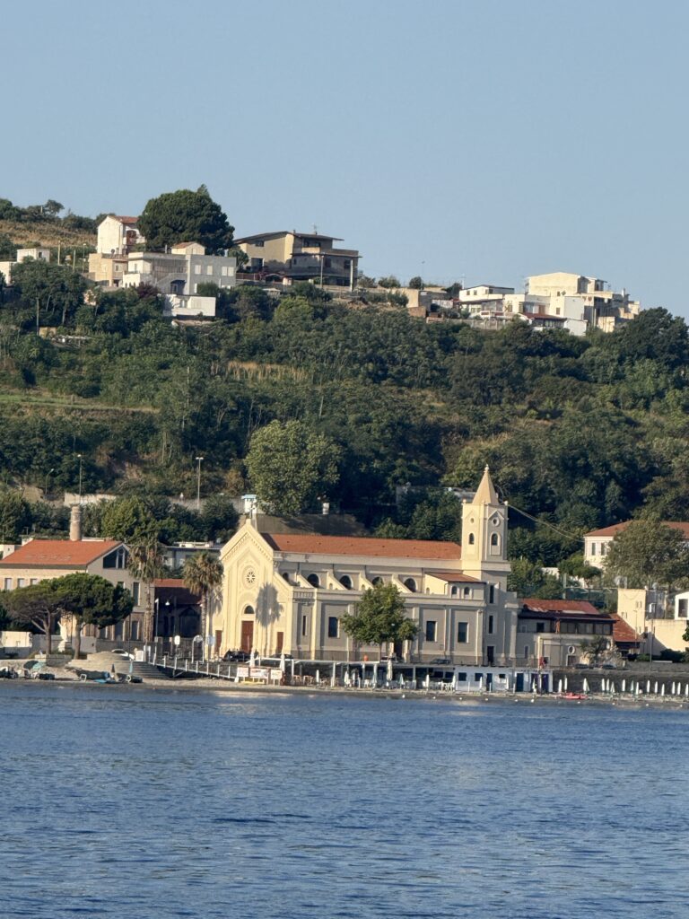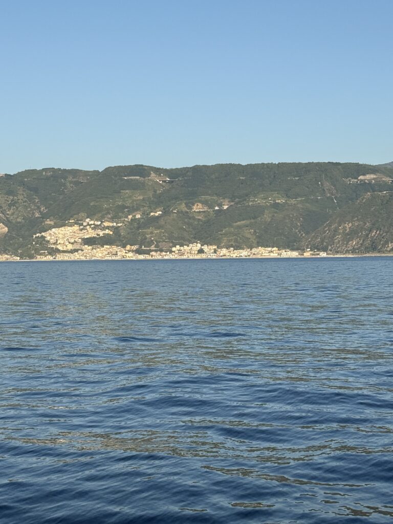 We paused for the night at an anchorage in Scilla, staged well to pass through the Strait of Messina the next day. Scilla is a picturesque town steeped in legend. In Greek mythology, Scylla, the fearsome sea monster said to dwell in the cliffs here, guarded one side of the Strait of Messina, while Charybdis, a deadly whirlpool, menaced sailors from the other. To ancient mariners, navigating these waters meant passing between two monstrous dangers. As we prepared for our own crossing, it was easy to see how these swirling currents inspired myth.