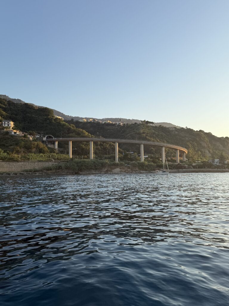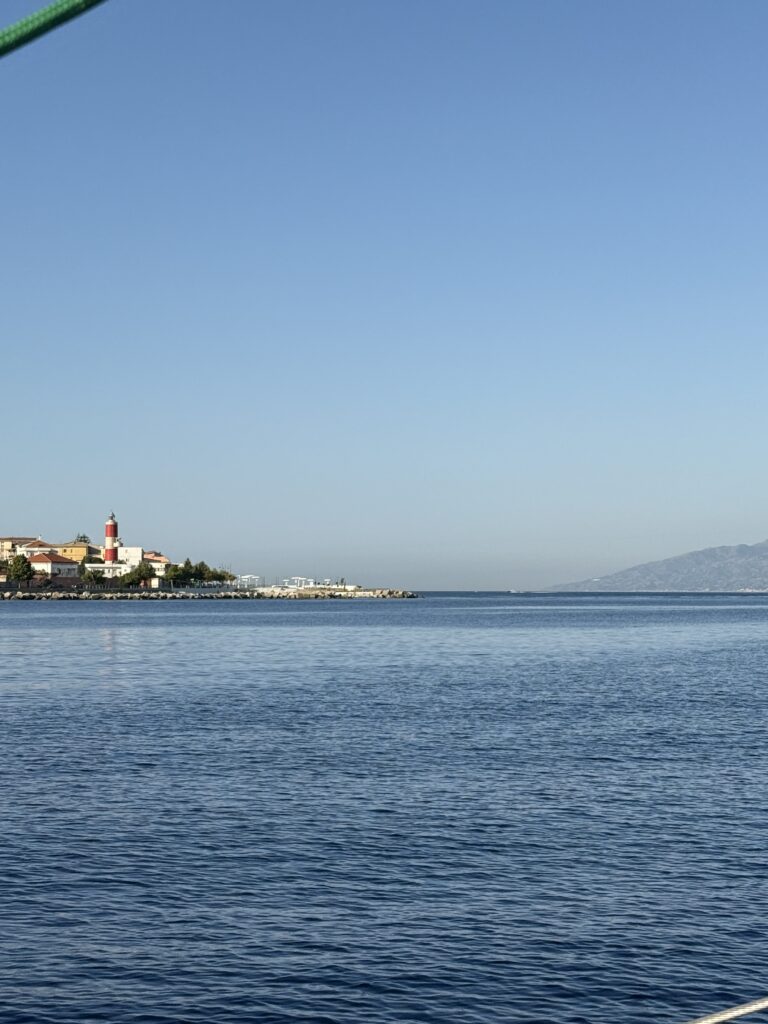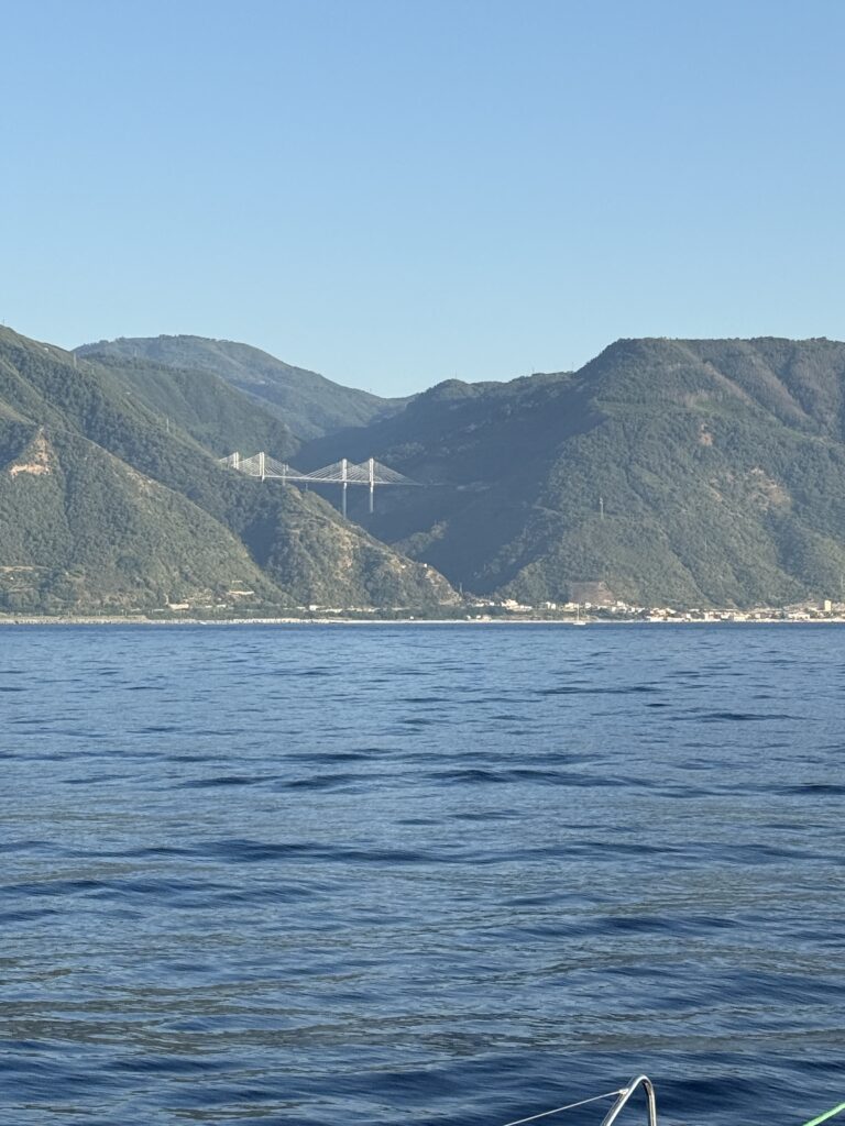 Thanks to well-timed planning, the current carried us forward like a sling, pushing Kora to speeds of nearly 10 knots – a huge boost from our usual 5-6 knots!!! In the opposite direction, we’d have been clawing through the water. The Strait is known for fast tidal flows, eddy currents, and the occasional whirlpool (you can even see the swirl in our video). It’s a meeting point of two seas – the Tyrrhenian to the north, the Ionian to the south – so waters get choppy, restless, and occasionally unpredictable.