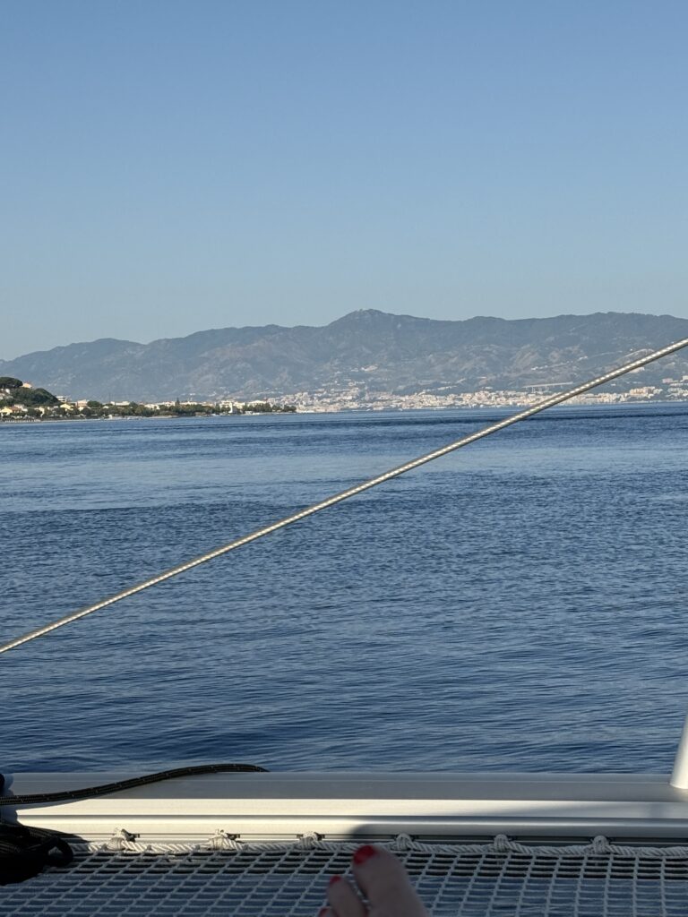 After a whirlwind city detour, we were back where we belong – on Kora, and on the sea. Landing in Lamezia just before 11am, we quickly shifted gears. Karen dashed off to restock provisions while Doug handled marina checkout. A little after noon, we had left the dock and were already slicing through the blue toward Calabria, in a little bit of a daze, feeling the fatigue of our fast-paced Berlin detour.