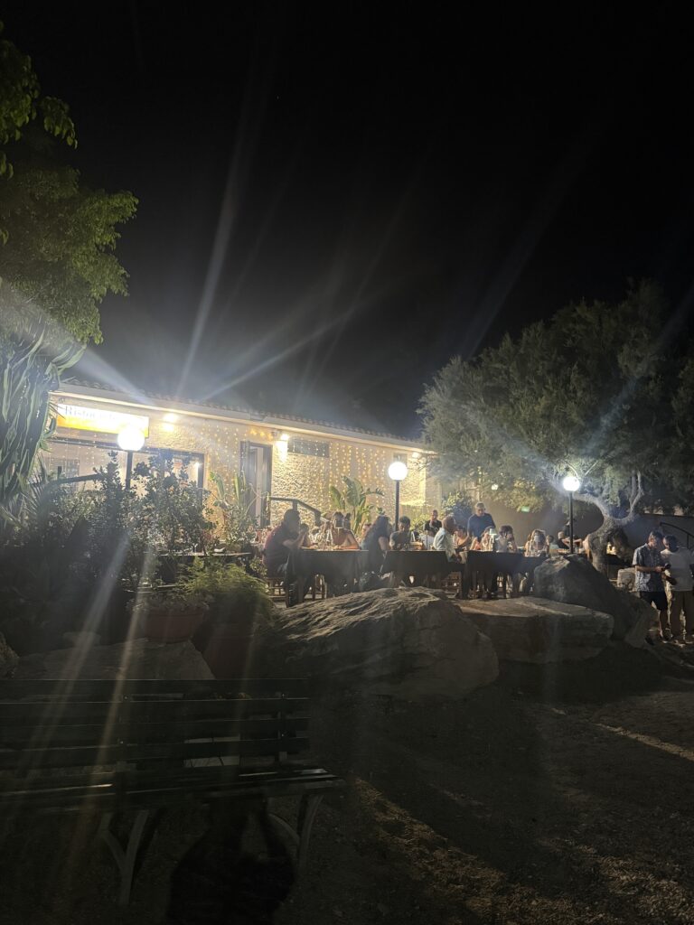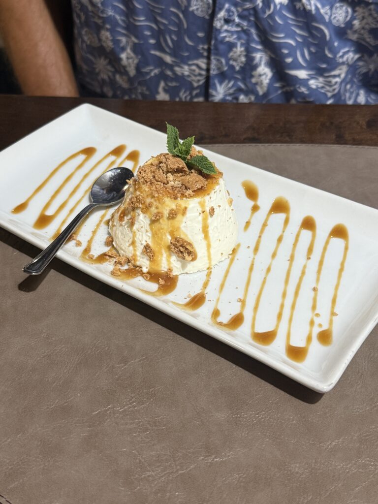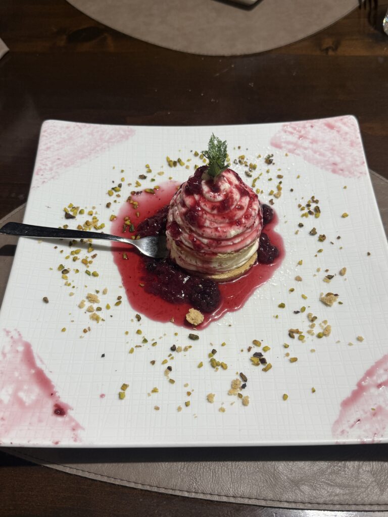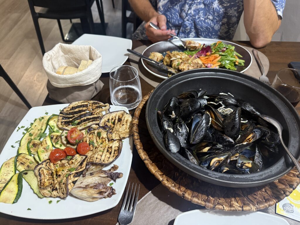 With the promise of a full-sized grocery store on offer (we’ve been shopping at essentially corner stores for the past several weeks), we headed off shortly after arriving for the 1km walk to the local mall and returned laden with supplies. But no need to hike back; the marinero picked us up right at the shops and zipped us back to Kora. Such a blessing!!! Later, we returned to shore for dinner – and what a feast it was. Swordfish, mussels, and a sweet finale of berry cheesecake and panna cotta, enjoyed under a warm Calabrian sky. A perfect setting to quietly celebrate our silver wedding anniversary a few days early, knowing we’d likely be at sea when the official day arrived.