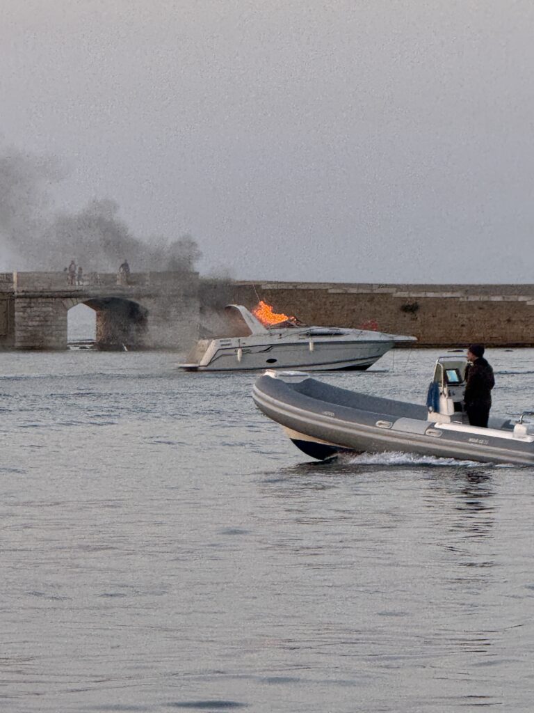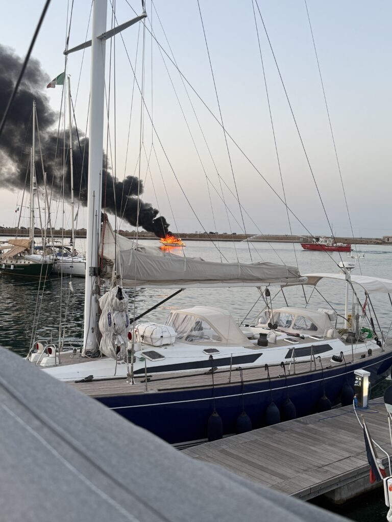 Then … just as we were cooling off … a plume of black smoke broke the calm. A boat near the marina was on fire; likely, a brave soul had moved it from the dock and thrown the anchor just in time to avoid a mass catastrophe before jumping overboard. We were shocked at how rapidly it became fully engulfed in flames. Our hearts broke for the owners, and we were reminded how quickly disaster can strike. A boat fire at sea is even more terrifying – no help nearby, no safe escape, and the unthinkable reality of having to abandon ship into open water. When the fireboat roared in, its wake rocked the marina – Doug scrambled and tossed out one of our large ball fenders just in time, saving Kora from a hard knock. Fortunately, they were able to put the fire out fairly quickly, and we heard reports the next day that no one had been injured.