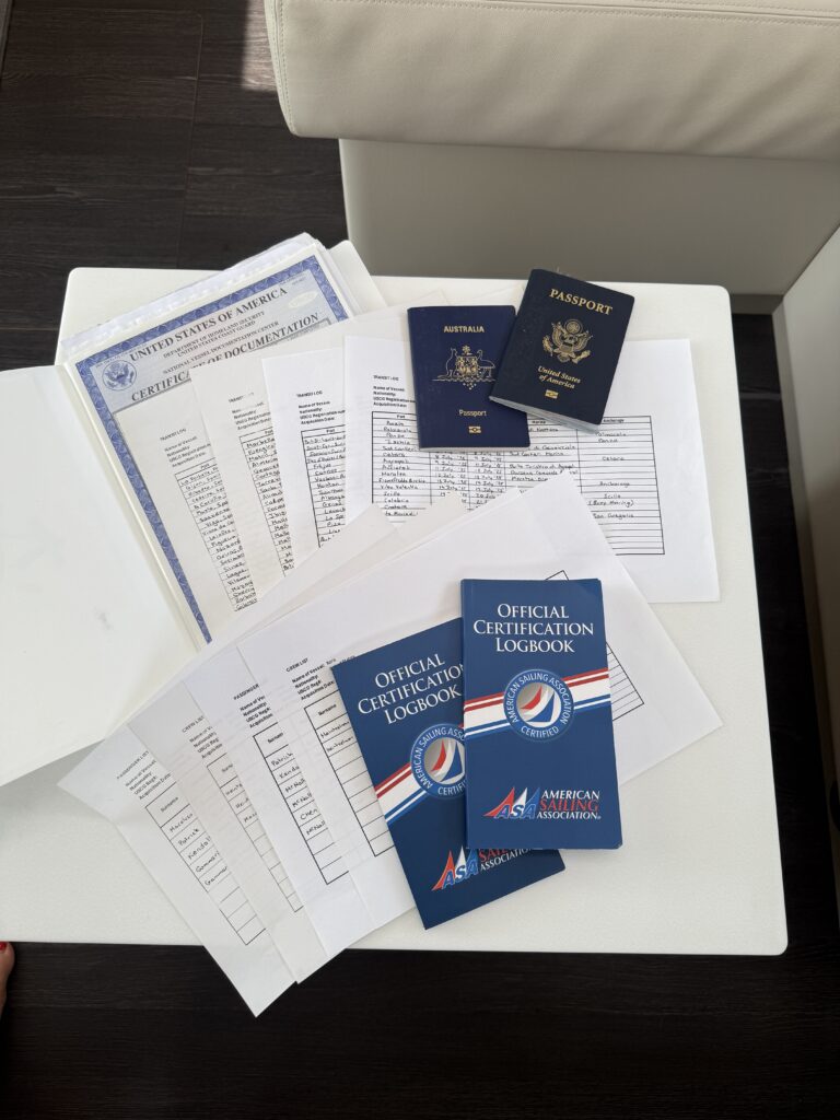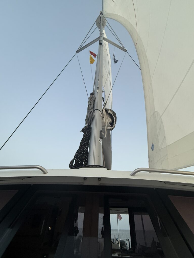 Above, you can see all four flags currently flying on Kora. On the starboard spreader are the flag of Montenegro – where we’re presently sailing as I write this post – and the yellow Q flag, indicating we’ve entered from international waters and are awaiting customs clearance. The port spreader is reserved for courtesy or personal flags; we’re proudly flying the Australian flag – my home country. And at the stern flies the U.S. flag, required for all vessels registered in the United States, like Kora.