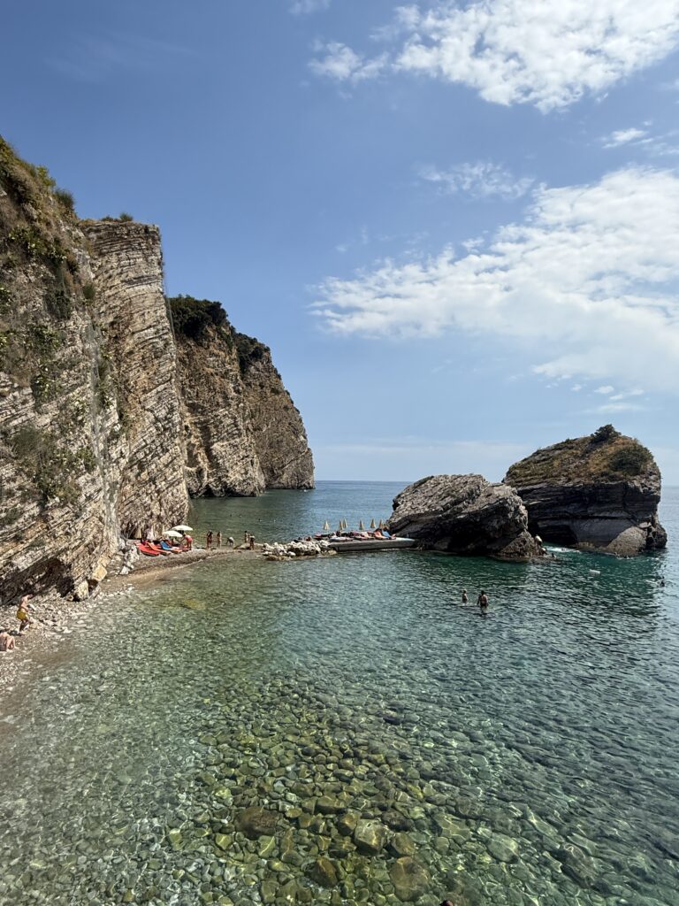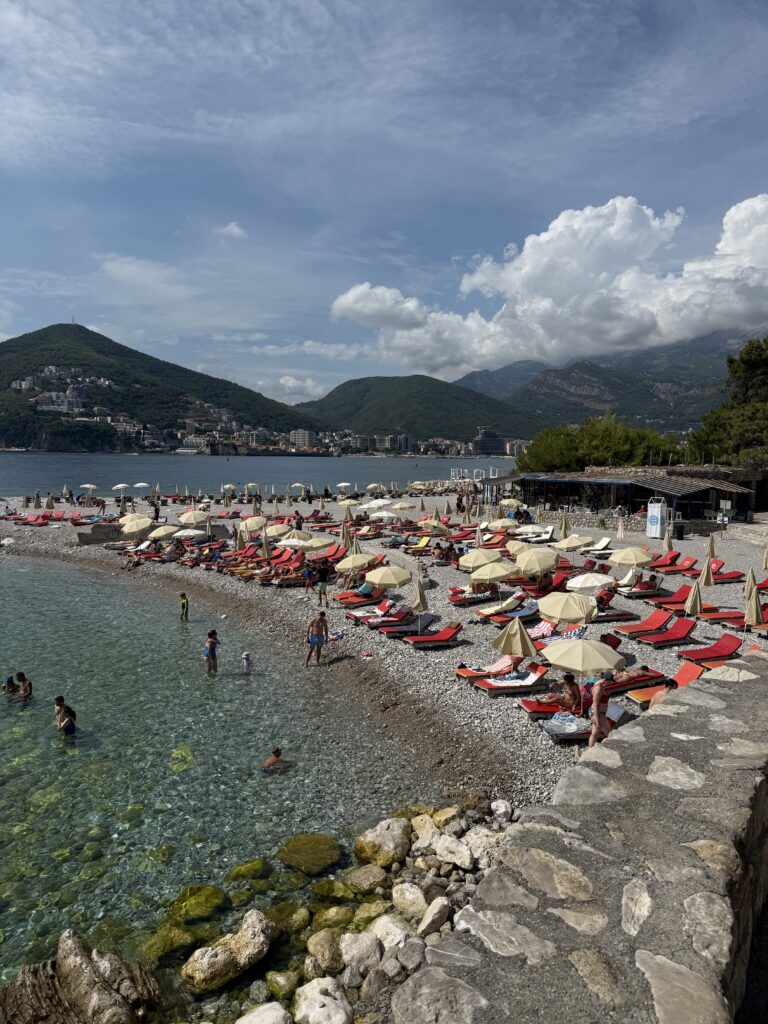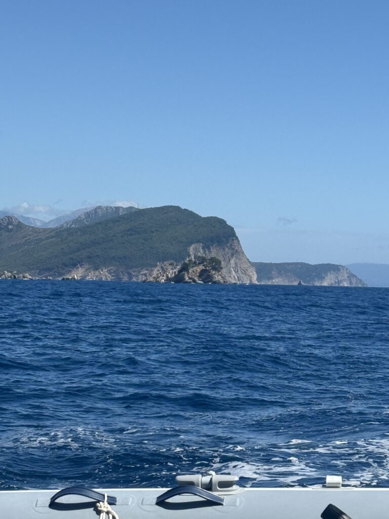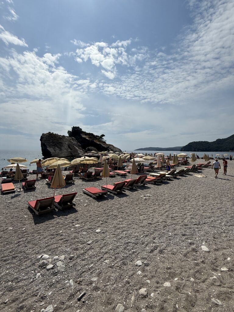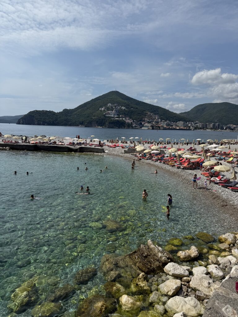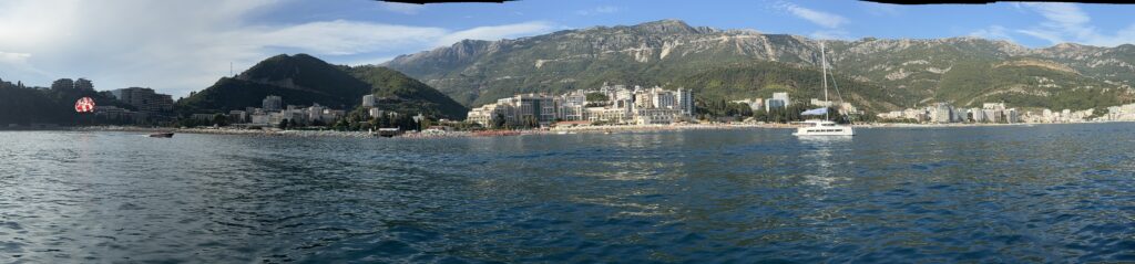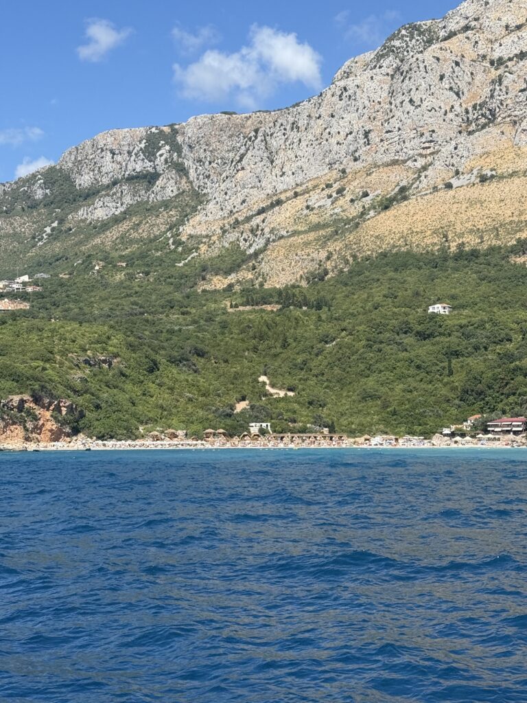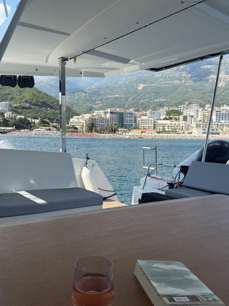 We took a short 16 NM sail up the coast to Becici, near Budva – an easy run that wound past a string of beach clubs, bustling waterfronts, and spectacular rocky cliffs jutting out into the Adriatic. The coastline here is dramatic and full of life, with each curve revealing another hidden cove or sun-drenched resort.
