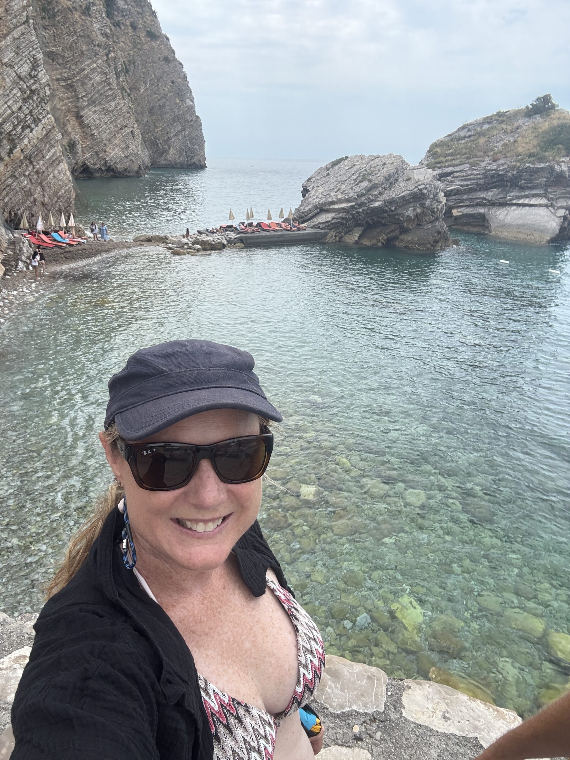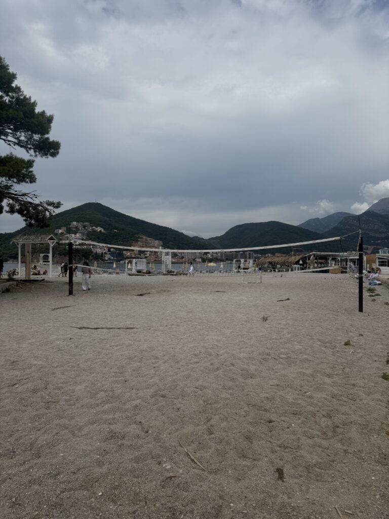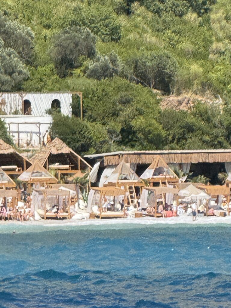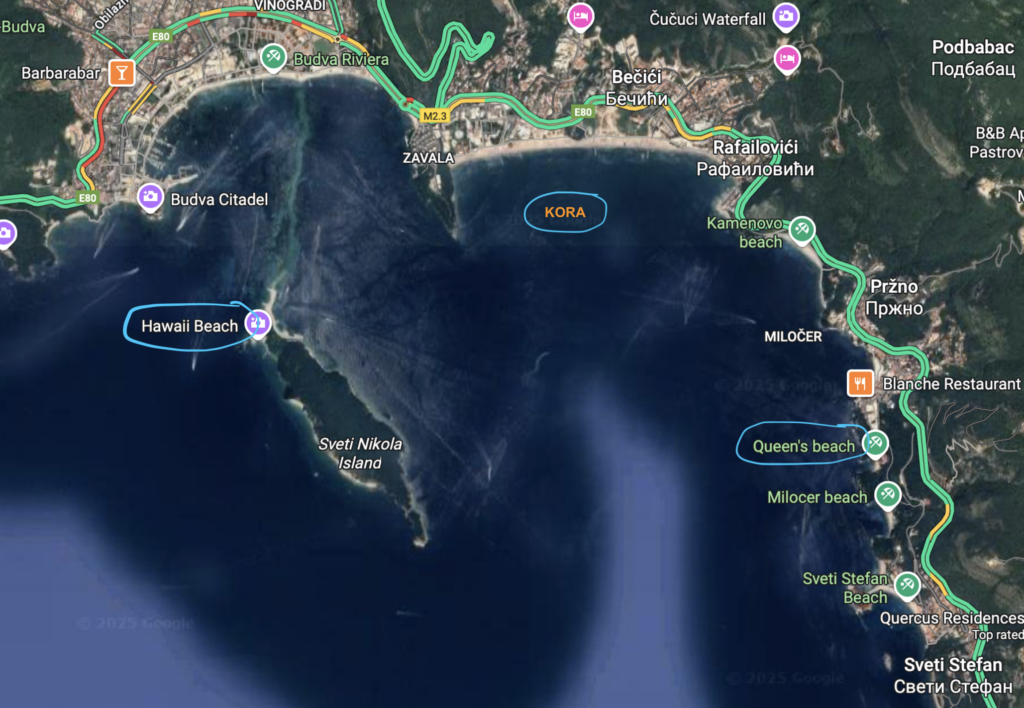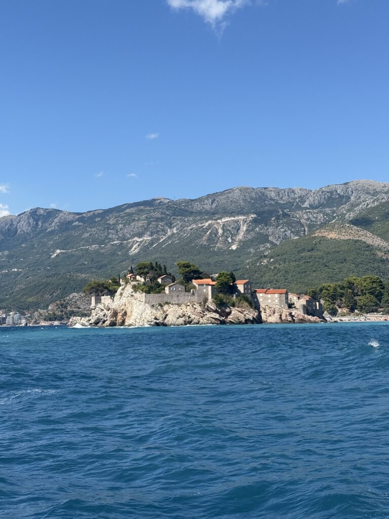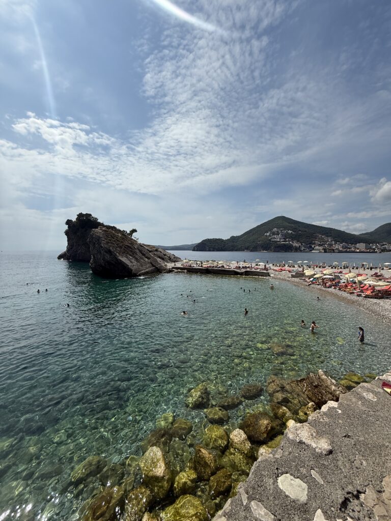 We took a short 16 NM sail up the coast to Becici, near Budva – an easy run that wound past a string of beach clubs, bustling waterfronts, and spectacular rocky cliffs jutting out into the Adriatic. The coastline here is dramatic and full of life, with each curve revealing another hidden cove or sun-drenched resort.