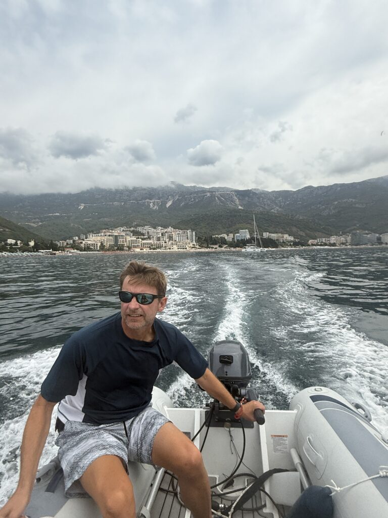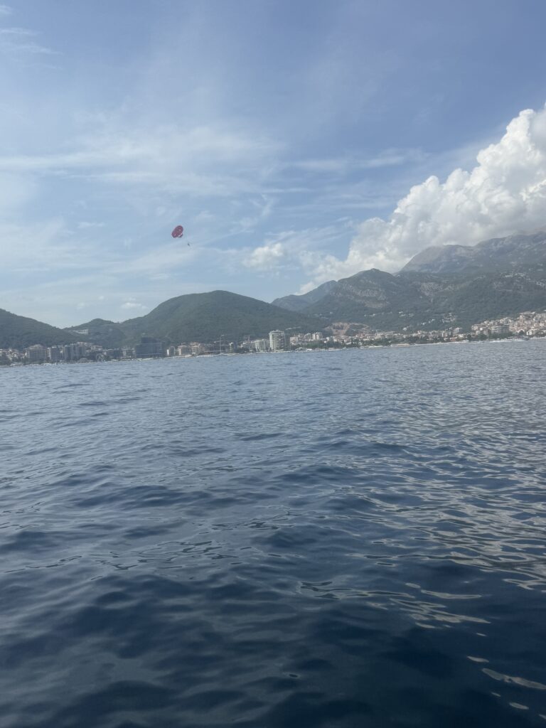 From our pretty anchorage just off Sveti Stefan Beach near Becici, we had front-row seats to the madness unfolding across Uvala Bay: paragliders and parasailers dangling from the skies, inflatable lounges packed with kids bouncing wildly behind speedboats, jet skis carving wild turns like torpedoes, and a guy clinging to a donut tube for dear life – biceps flexed, dignity questionable. It was beach resort chaos in full swing – thrilling, a little reckless, and wildly entertaining.
