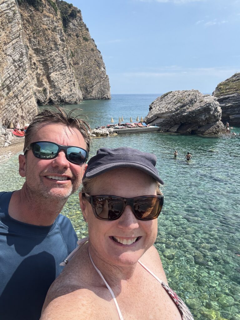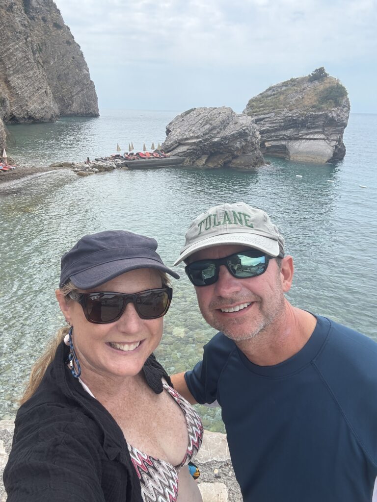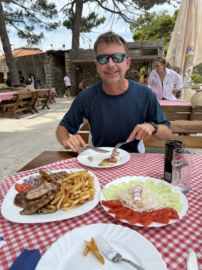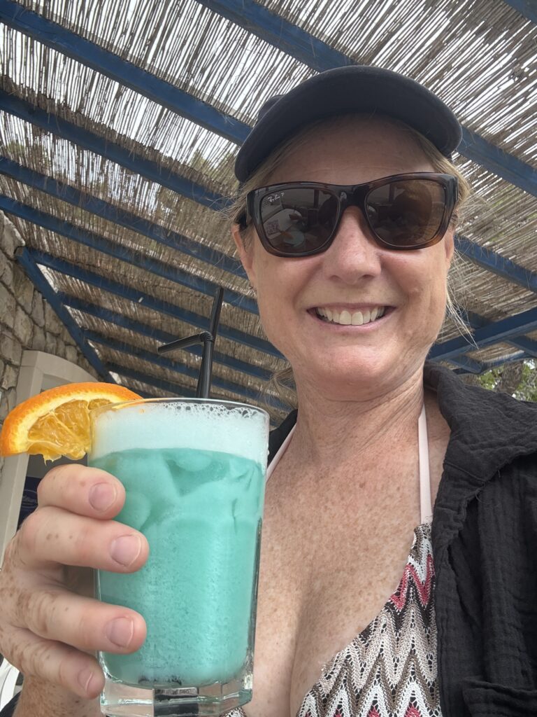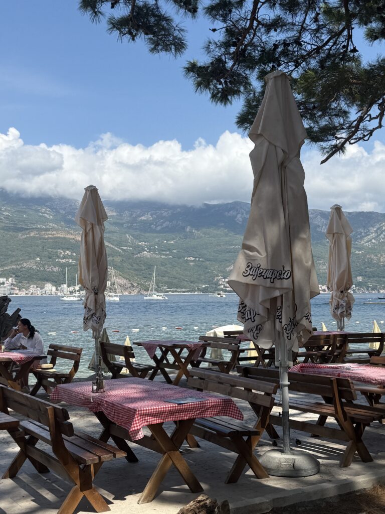 Docked, we went to pay for our dinghy spot. Doug realized he had forgotten his wallet. And they didn’t take Apple Pay. Or credit cards for that matter. Montenegro only deals in cash! So back across the water we went, Doug becoming a noticeably faster dinghy driver under financial duress. Second try: success. Drinks in hand – Hawaiian Delight for me, creamy banana milkshake for Doug. Gorgeous view. Perfect!