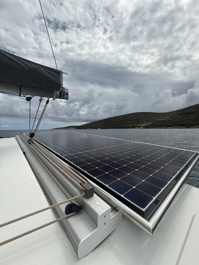 That evening, Karen gave Kora a much-needed wipe down – finally clearing off the clay brown dirt blown down from the mountains in Brindisi and the black dust from the boat fire we’d seen there. The solar panels, however, were left untouched. Karen meant to snap a photo to send to Steve (“When’s your cleaning crew stopping by?”) but decided it was a job for another day. Except… that night it rained…