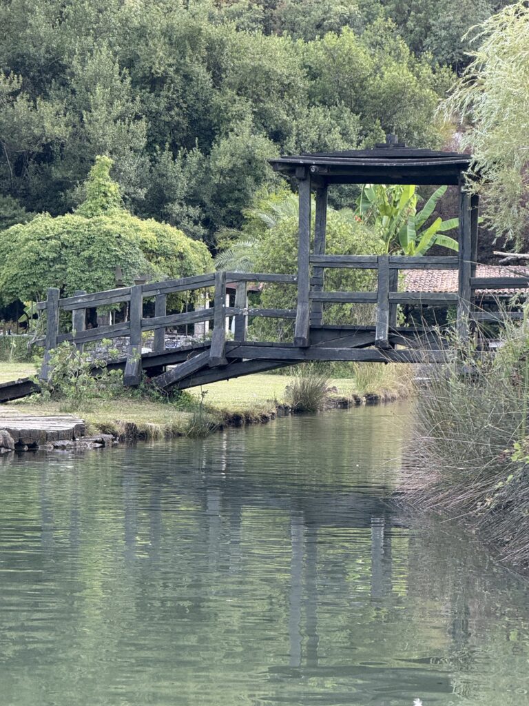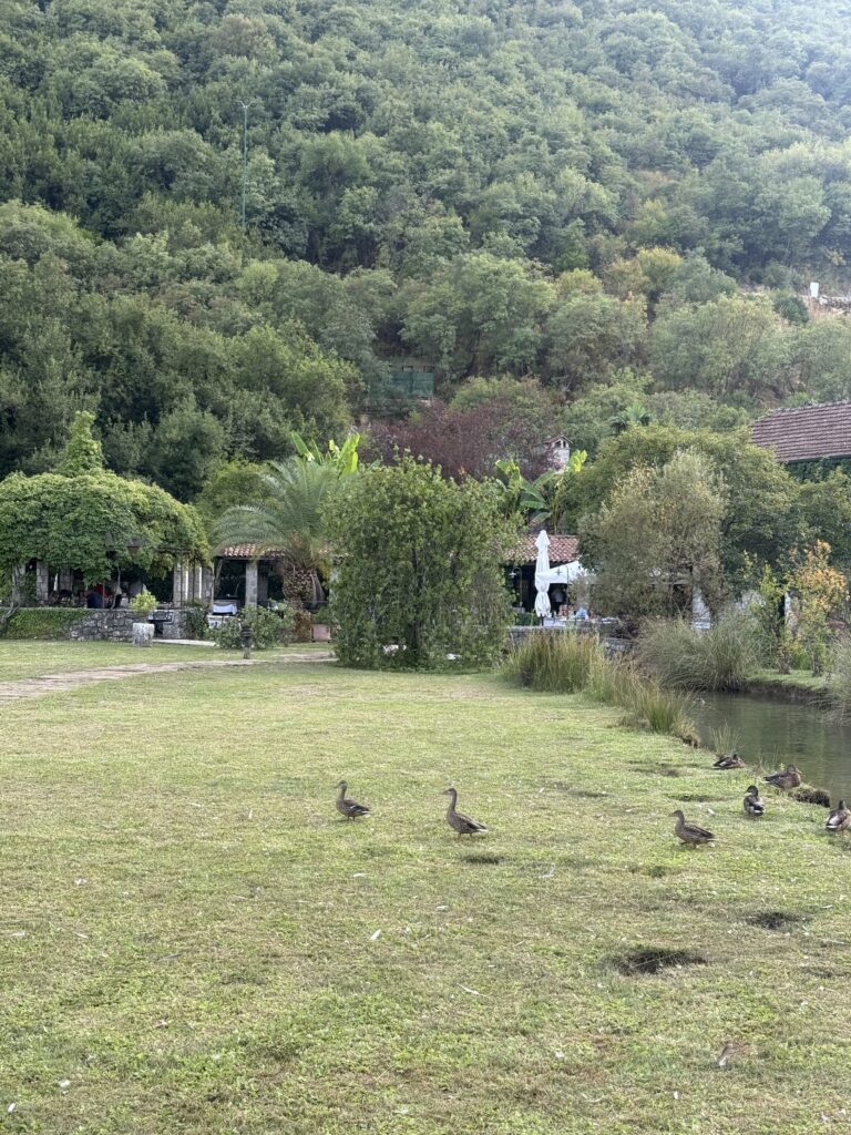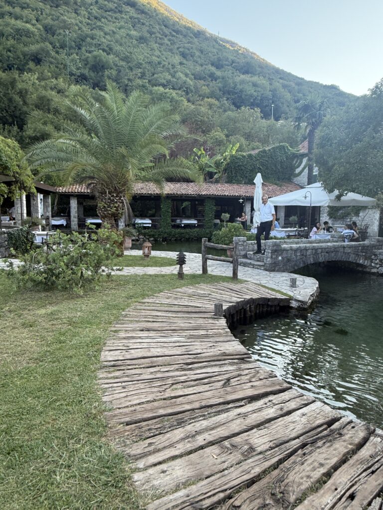 What a setting! Ćatovića Mlini isn’t just a restaurant – it’s a whole mood: a centuries-old mill turned oasis, with lush gardens, wooden bridges, and lanterns twinkling over stone-lined waterways. It felt like stepping into a fairy tale – if the fairy tale involved garlic-infused home-pressed olive oil, amazing seafood, and chilled Macedonian wine.