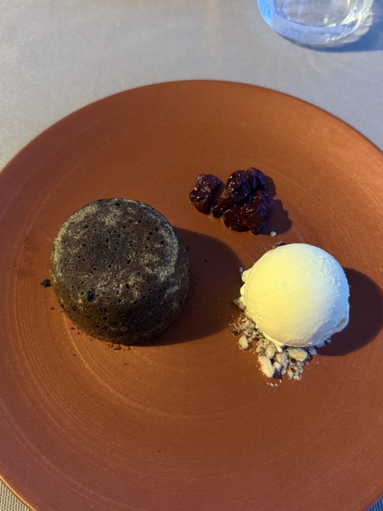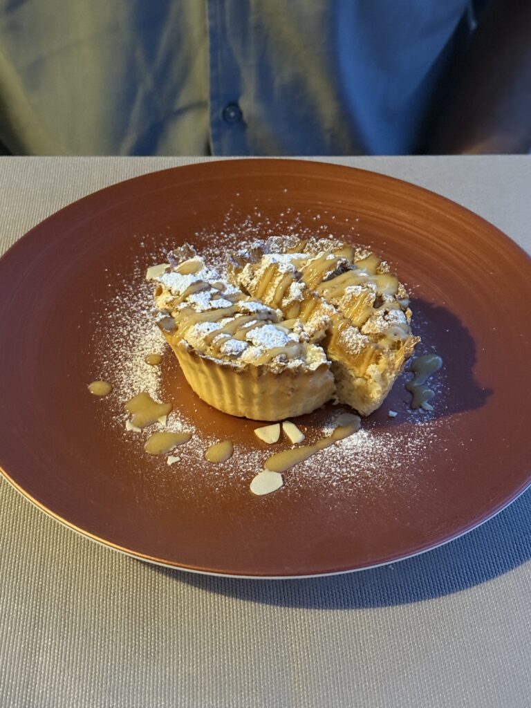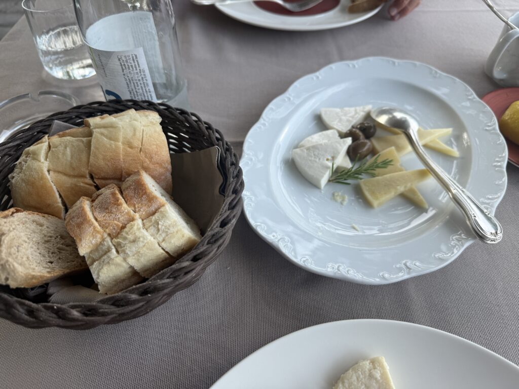 We began with fresh-baked Montenegrin bread (oh, how we’ve missed good bread – Italy, we love you, but while your pasta rocks, your bread does not!), an assortment of homemade cheeses, and a drizzle of olive oil that tasted like sunshine and sea spray. For mains: sea bass with truffle cream and black rice (Karen) and zucchini-wrapped prawns with carrot sauce (Doug). Every bite: decadent. We finished with a duet of desserts – rich chocolate fondue and the local delicacy, Boka Kotorska cake, a centuries-old recipe reserved for weddings, holidays, and, as it turns out, farewell dinners.