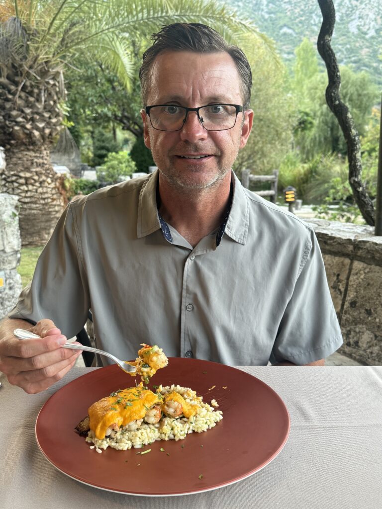 But don’t let the laid-back vibe fool you! We were still on the hunt for something memorable. Enter Konoba Ćatovića Mlini, tucked into the lush river estuary of Morinjski Zaliv. Originally, we had planned to dine there the next night… until we realized we’d miscalculated and needed to be anchored near our checkout point in Zelenika by the next morning. Cue a scramble to shift our reservation, pull anchor in Uvula Ljuta, and motor 1 hour to the next inlet, Morinjski Zaliv. The effort was worth every nautical mile!!!
